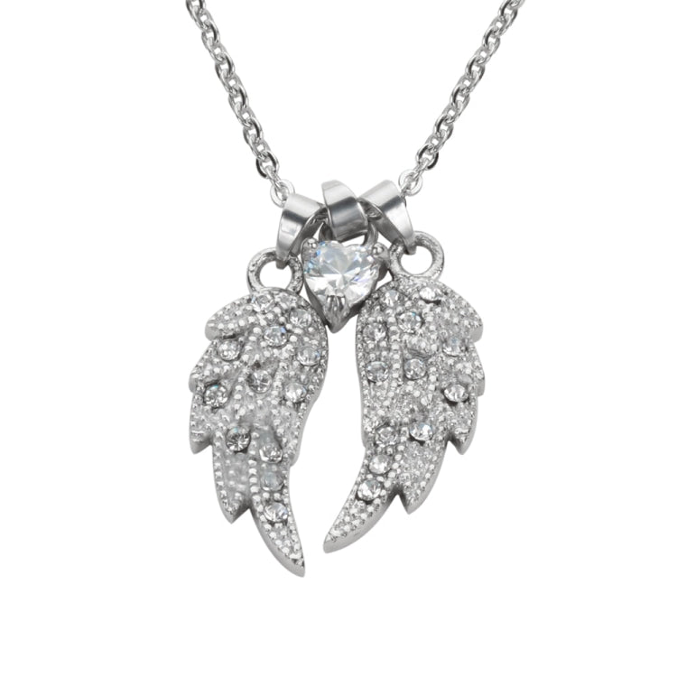 SK1509 Ladies Double Angel Wing Crystal Heart Shaped Center Stone Necklace 19" 1 1/2" Wide Stainless Steel Motorcycle Jewelry
