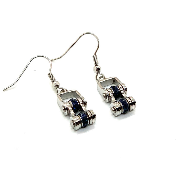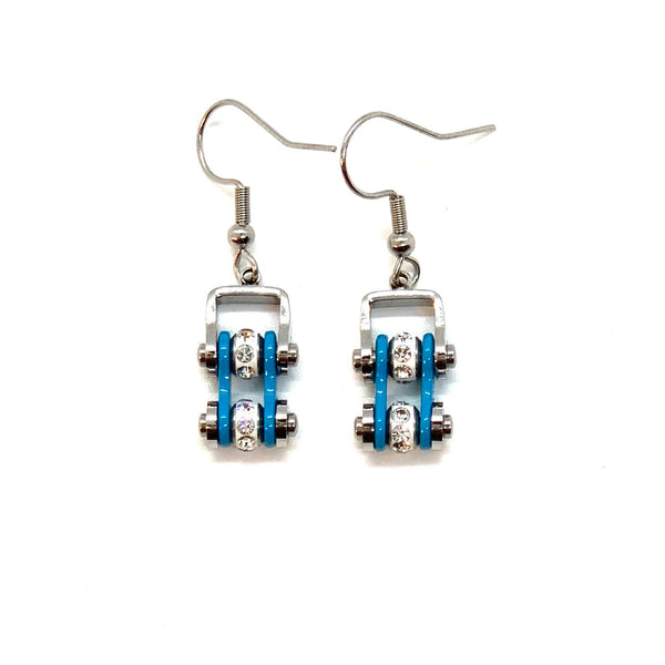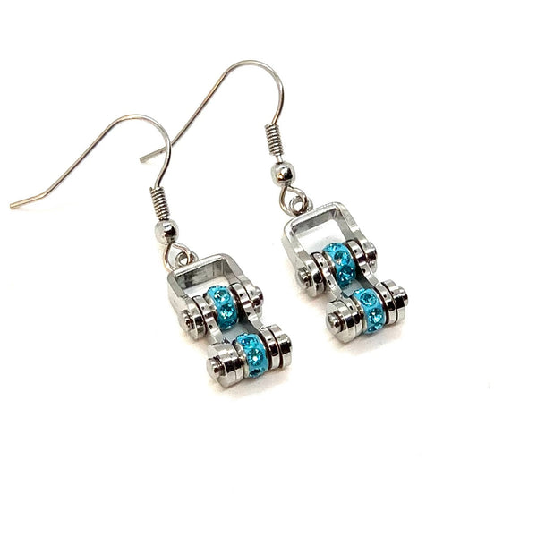 • Sk2004E Mini Two Tone Silver Turquoise With Crystal Centers Bike Chain Earrings Stainless Steel