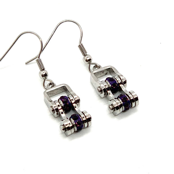 SK2210E February Edition Mini Mini 3/8" Wide Stainless Steel Amethyst Imitation Crystal Earrings. Matches SK2210 Bracelet.