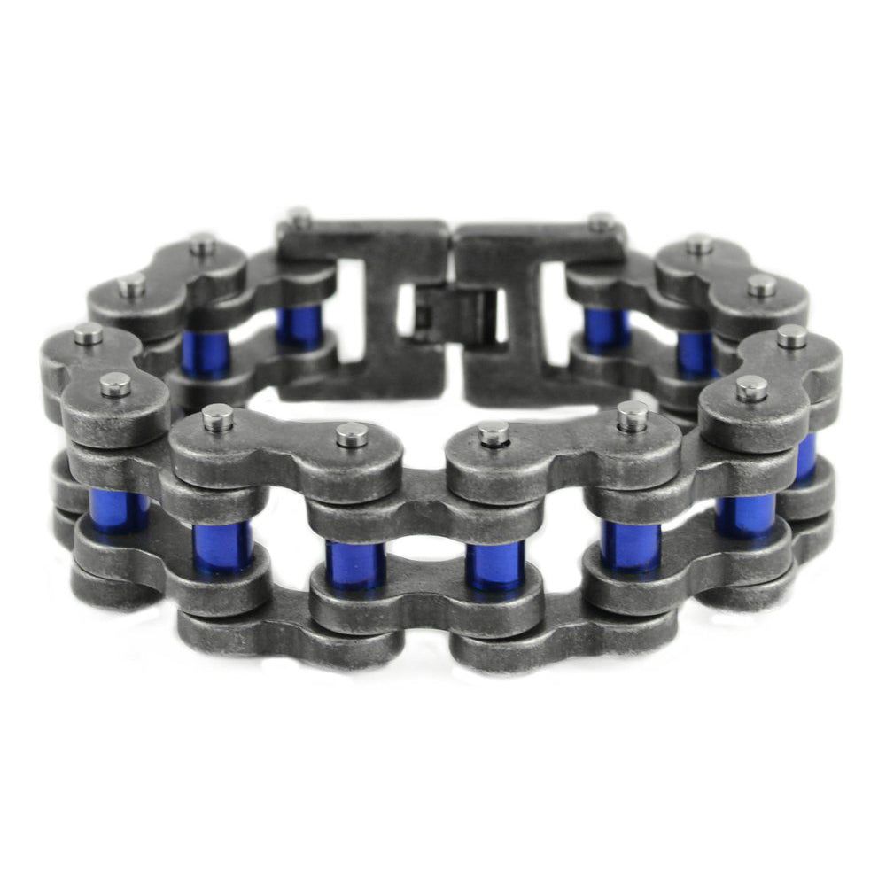 SK1839 Distressed Antique Finish 1" Wide With Candy Blue Rollers THICK LINK Men's Stainless Steel Motorcycle Chain Bracelet