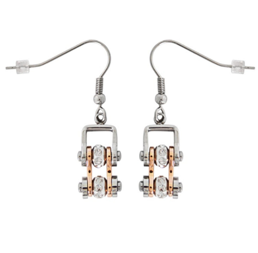 SK1844E MINI MINI SIZE EARRINGS Two Tone Silver Rose Gold With White Crystal Centers Stainless Steel Motorcycle Bike Chain