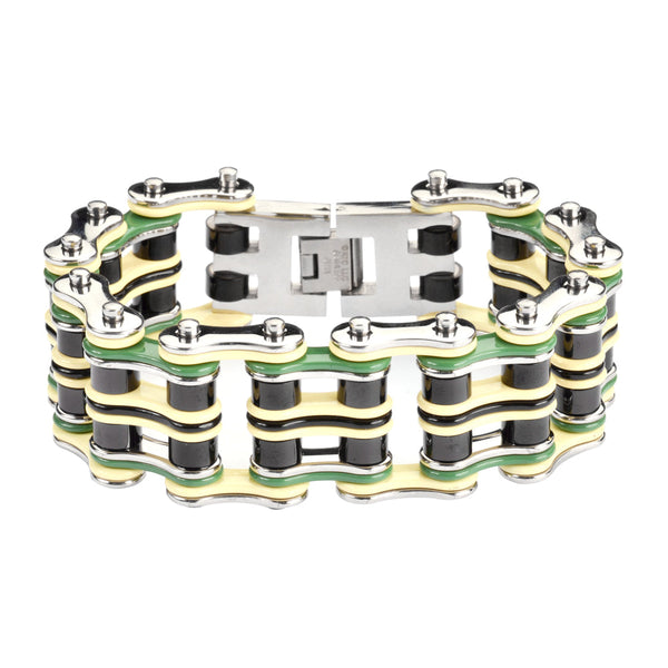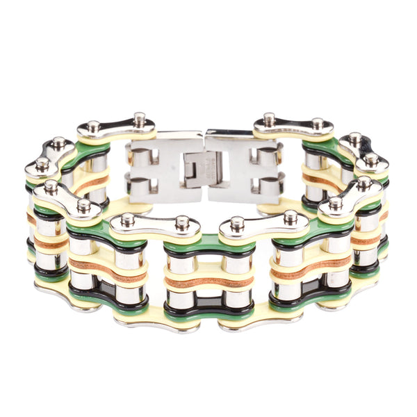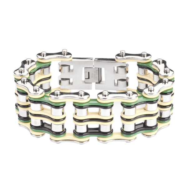 SK1135 Silver Cream Green Black 1" Wide men's Bike Chain Bracelet1" Wide Silver Cream Green BlackUnisex Stainless Steel Motorcycle Chain Bracelet