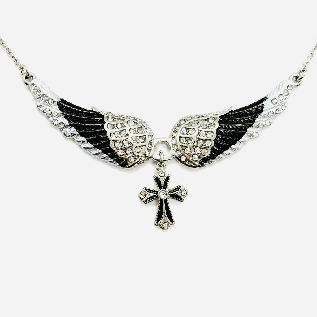 SK2323 Small Black Painted Winged Necklace With Cross White Imitation Crystals