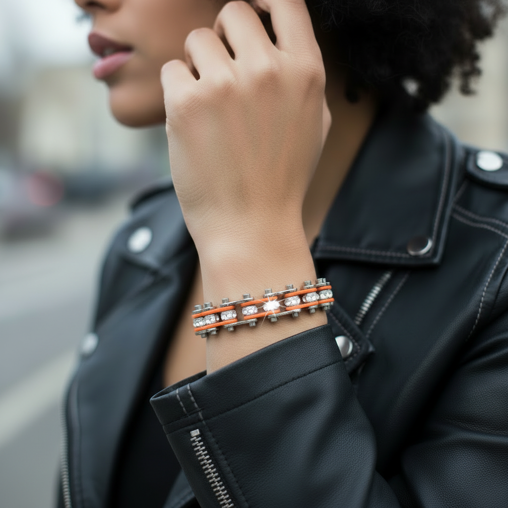 The Mini Size Two Tone Silver Orange With White Crystal Centers Stainless Steel Motorcycle Bike Chain Bracelet features bold crystal accents in Silver on a motorcycle-chain-inspired bracelet design crafted from high-grade 316l stainless steel. Designed to feel solid on the wrist and wear clean from day to night.
