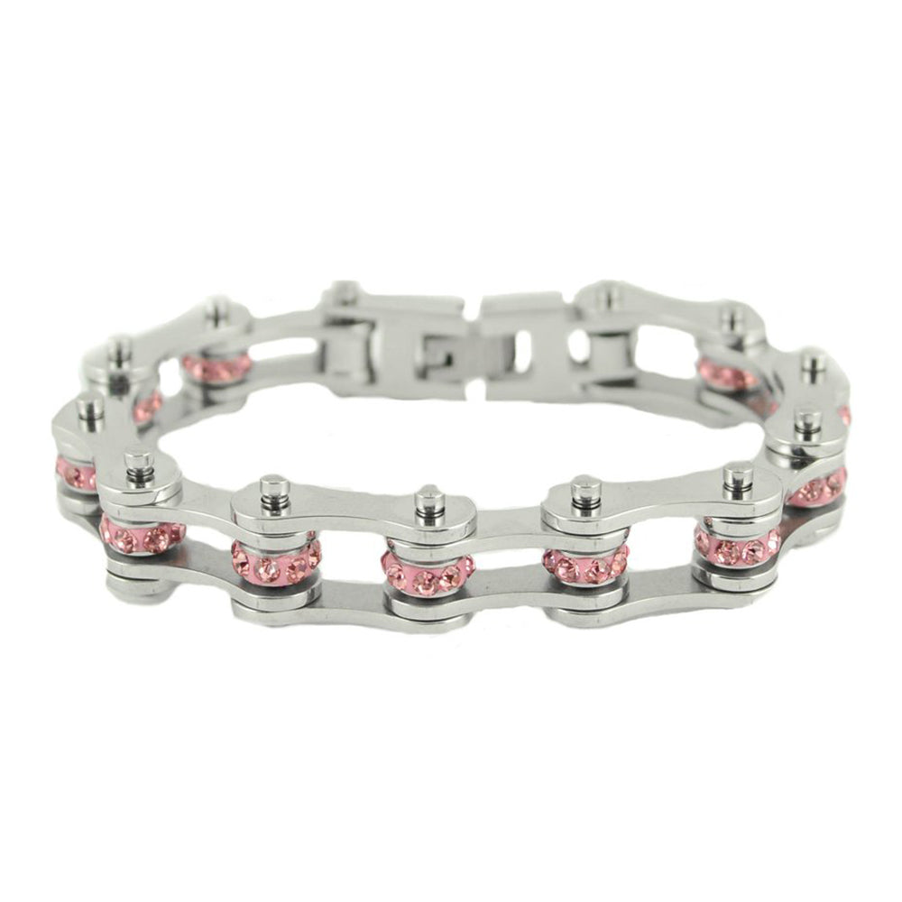 The SK2225 October Wide Tourmaline Color Crystal Centers Bracelet features bold crystal accents on a motorcycle-chain-inspired bracelet design crafted from high-grade 316l stainless steel. Designed to feel solid on the wrist and wear clean from day to night. Size: 1/2".